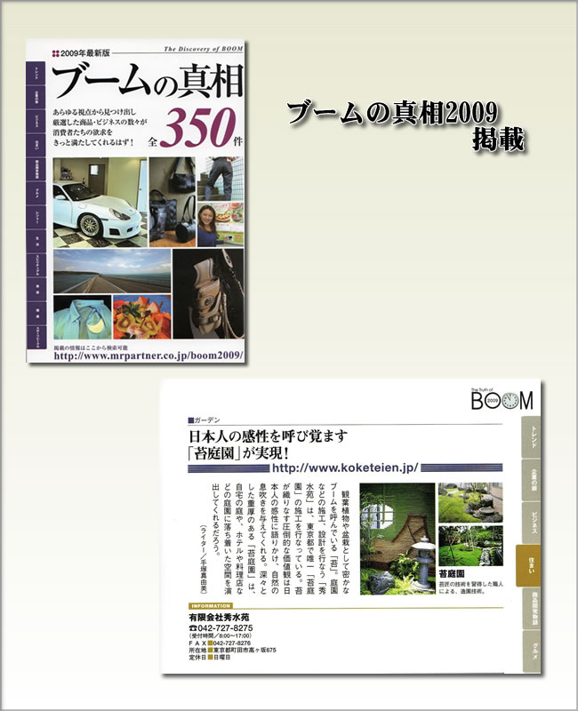 お庭、造園、植木、苔庭園、エクステリアの事なら有限会社秀水苑。東京都、神奈川