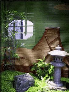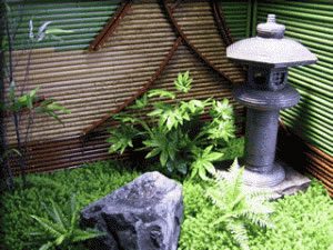 その後、里に灯籠、野原に人工樹木(室内の為)、緑の丘を人工杉苔で被い、手前に海原が広がるというような「景」をイメージ、施工させていただきました。