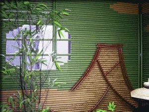 ただ背景に人工竹垣を施工するだけではなく、たまたま左上に通気用の四角い窓があったので、これを丸い月に見立てる事とし、(万が一の時、窓が機能しなくてはいけないとの考慮もあり)人工御簾垣に「富士山」の景色を描きいれました。
