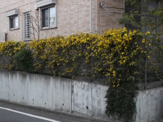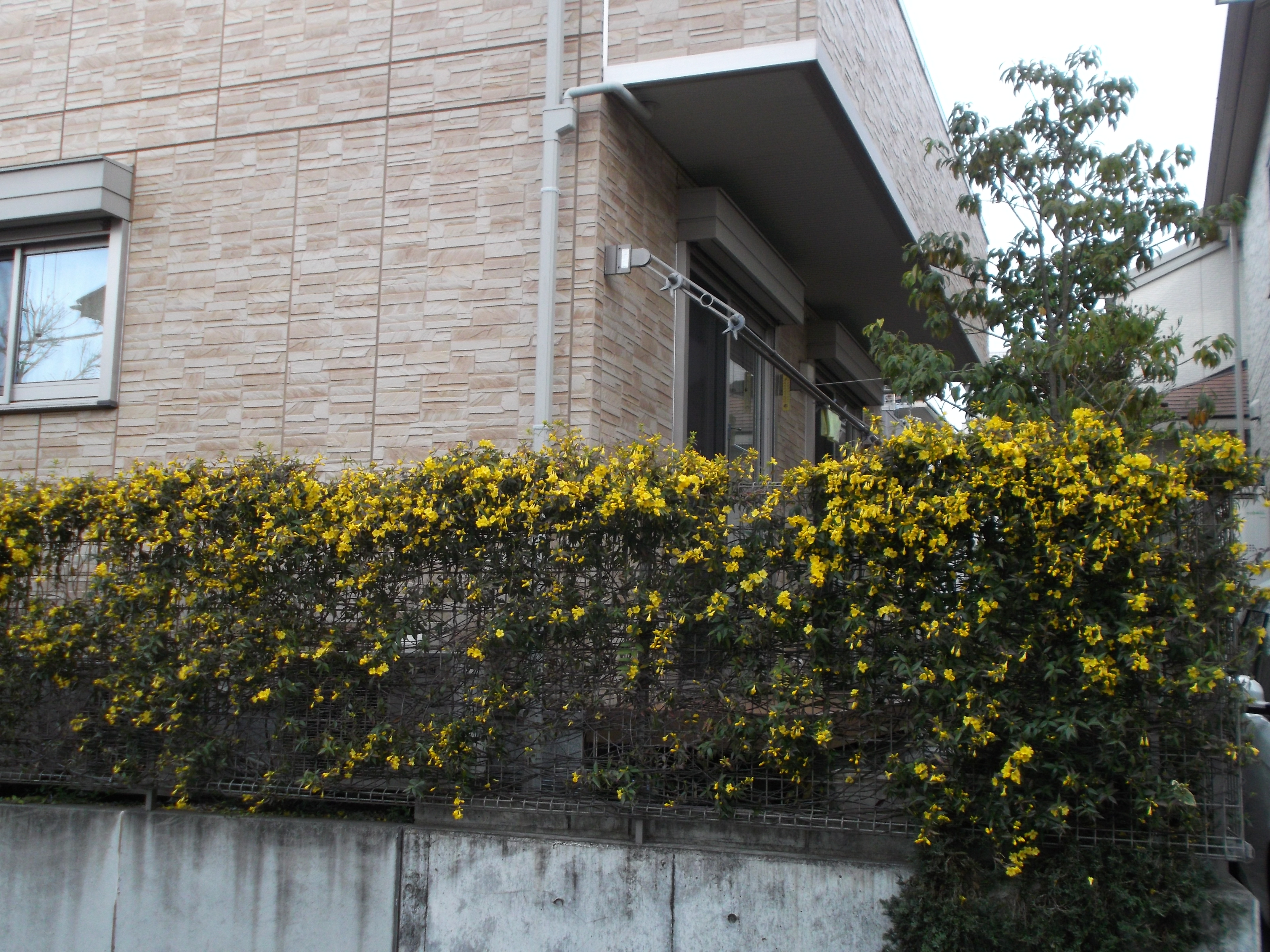 カロライナジャスミンとホリゾンタリスウィルトニーでフェンス、擁壁を被いました。春には可憐な花が咲きますし、寂しい冬も1年を通じ色鮮やかに彩りますので、施主様の大切なご自宅の景色の足元を引き締めています。