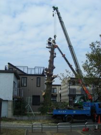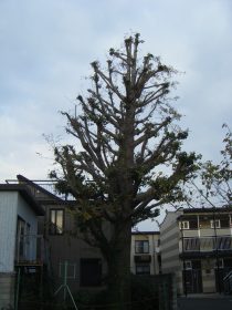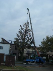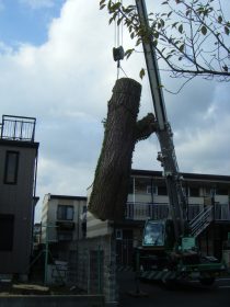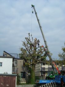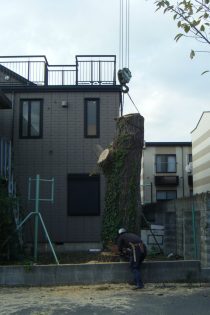 あまりにも大きくなってしまったイチョウの木の伐採風景です。 こちらも重機の会社に依頼し、合同で作業しました。 安全面に十分考慮しての作業ですが、1日で施工終了しています。