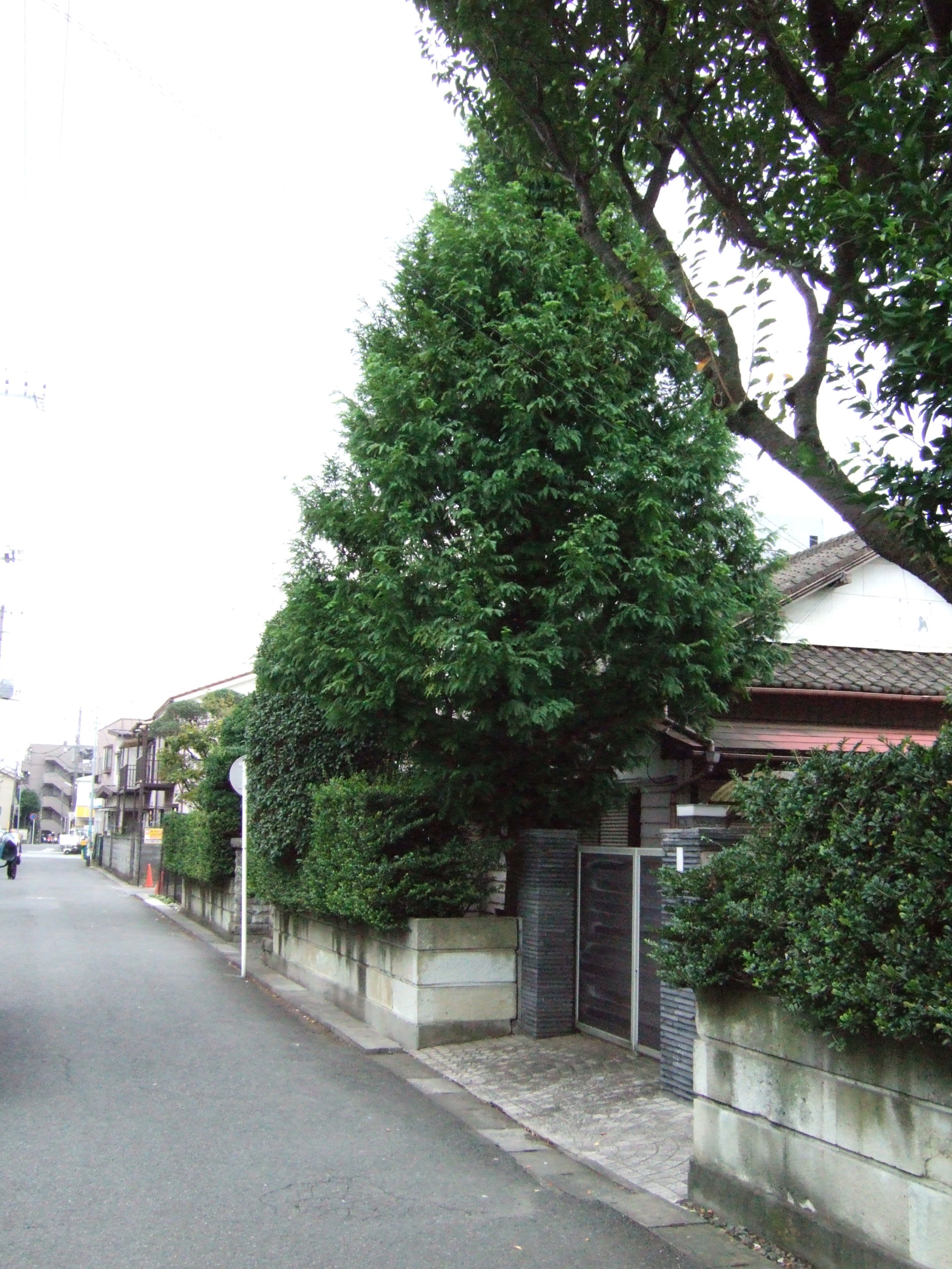 メタセコイアの剪定の風景です。大きく成長した植木を切り詰め、切り戻し作業をして樹形を整えています。