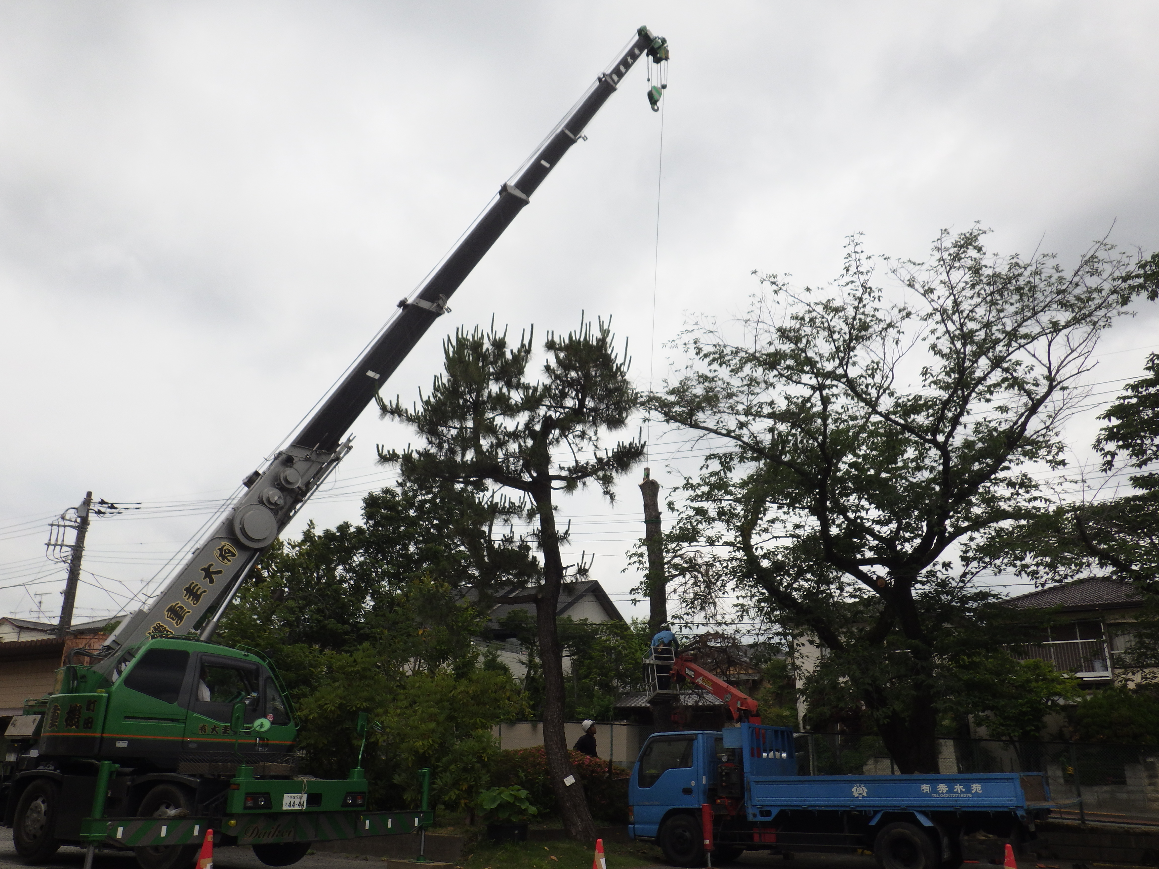 クロマツの立ち枯れ樹木です。安全面に考慮し、懇意にしていただいている重機の会社と合同で作業しました。